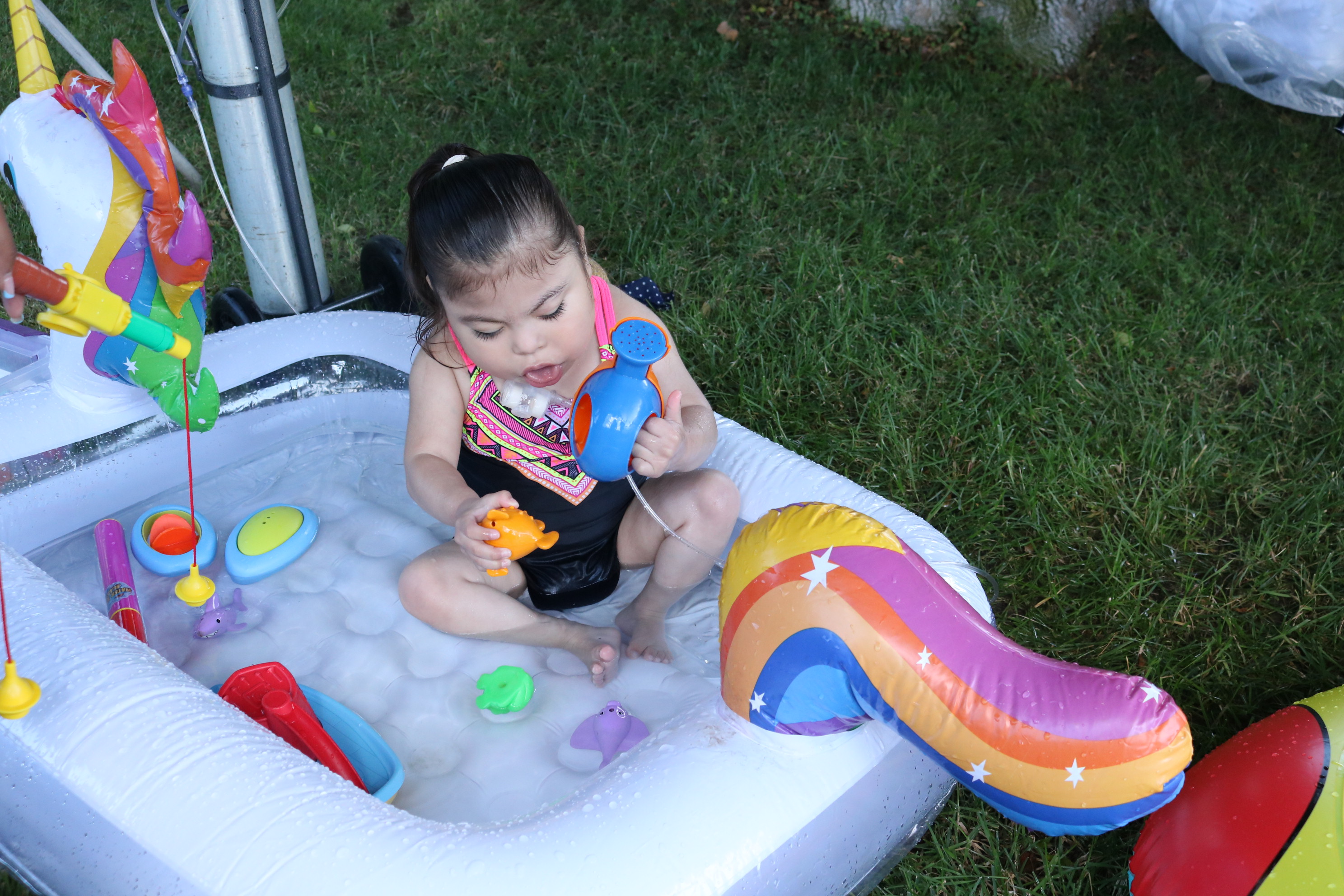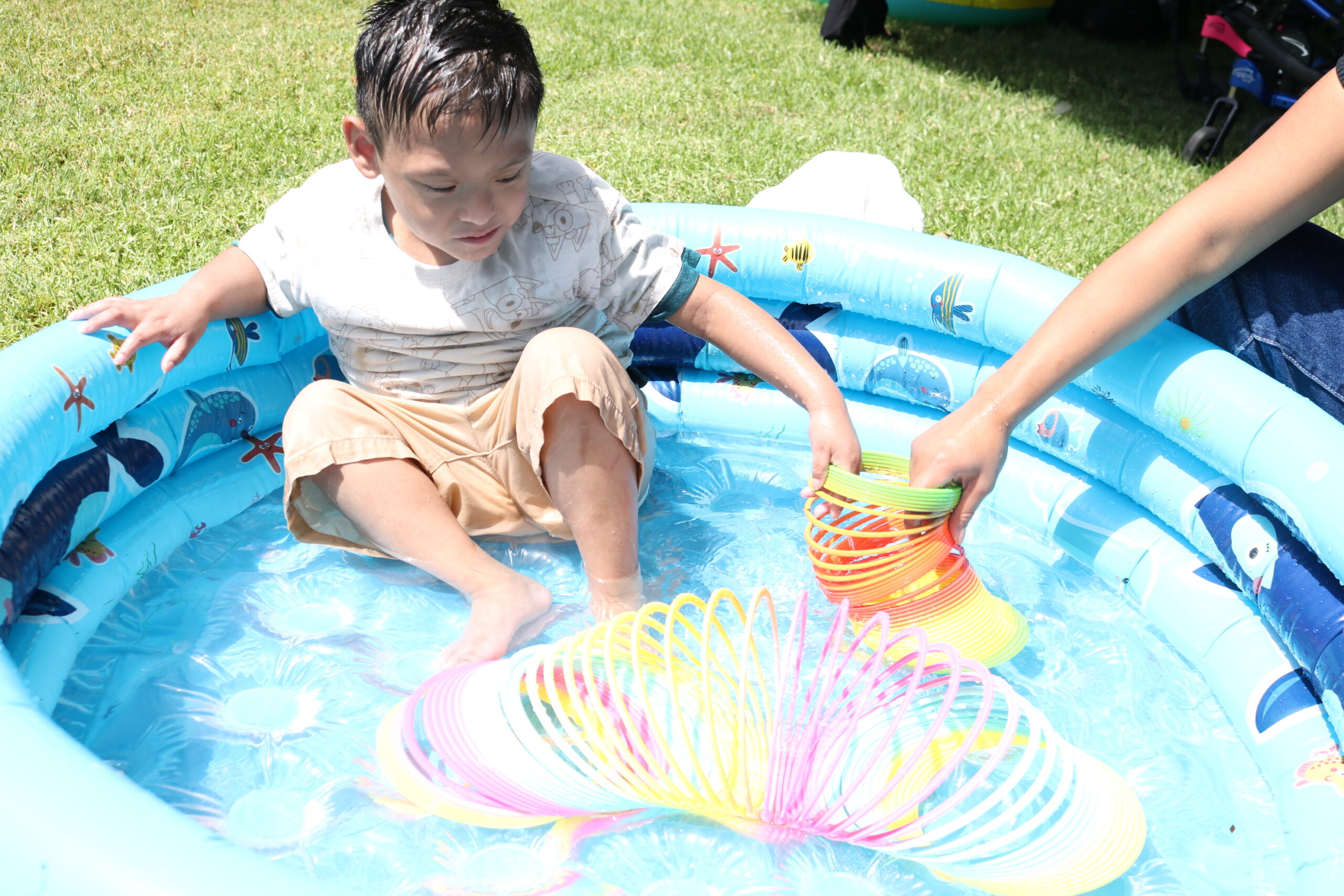 Some residents jumped right into the kiddie pools, splashing around and playing with water toys. Others preferred to dip their hands in and explore the water at their own pace. For those wanting a little breeze, the swings were a hit—offering movement and relaxation all in one. Bubbles floated through the air while other residents explored a variety of outdoor water and sensory items.